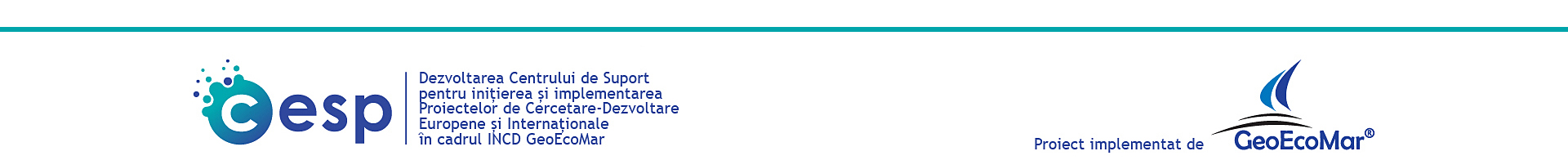 Institutul National de Cercetare-Dezvoltare pentru Geologie si Geoecologie Marina – GeoEcoMar implementeaza proiectul „Dezvoltarea Centrului de Suport pentru initierea si implementarea Proiectelor de Cercetare-Dezvoltare Europene si Internationale in cadrul INCD GeoEcoMar” - CESP, finanțat prin Programul Operațional Competitivitate, Axa Prioritara Cercetare, dezvoltare tehnologica si inovare (CDI) în sprijinul competitivitatii economice si  dezvoltarii afacerilor, Operatiunea: Crearea de sinergii cu actiunile de CDI ale Schema de ajutor de stat programului-cadru ORIZONT 2020 al Uniunii Europene si alte programe CDI internationale, Componenta 1 - CENTRE-SUPORT - Crearea de sinergii cu actiunile de CDI ale programului-cadru ORIZONT 2020 al Uniunii Europene si alte programe CDI internationale.